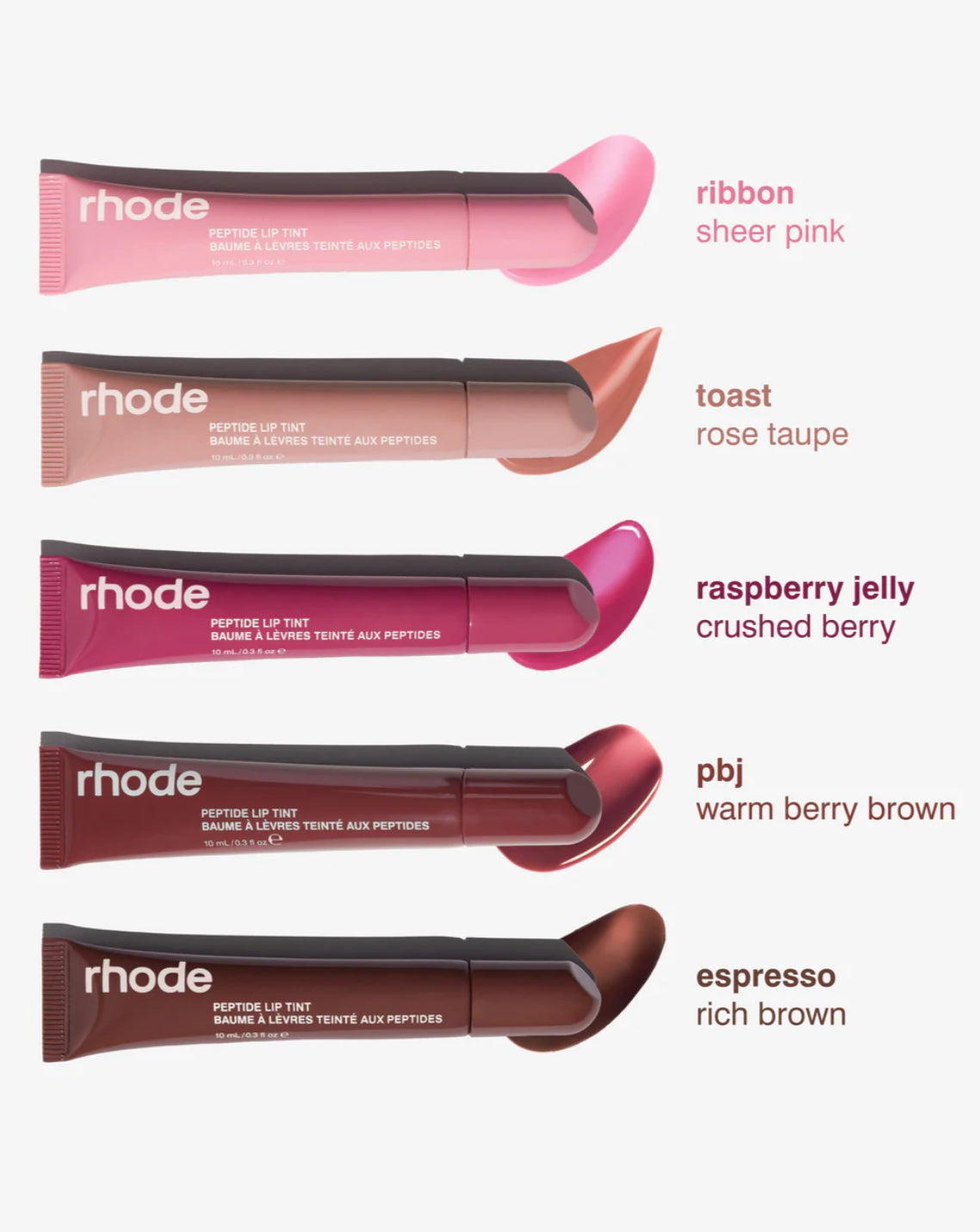 Includes: All five fragrance-free shades of Peptide Lip Tint in Ribbon, Toast, Raspberry Jelly, PBJ, and Espresso